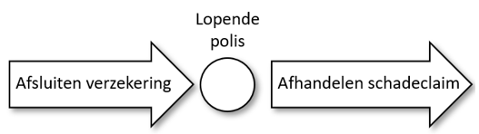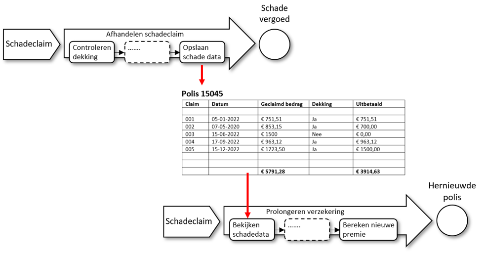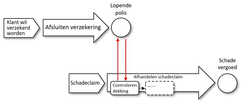 Dat betekent dat in het proces ‘Afhandelen schadeclaim’ de output (polisdata) van het proces ‘Afsluiten verzekering’ benodigd is.